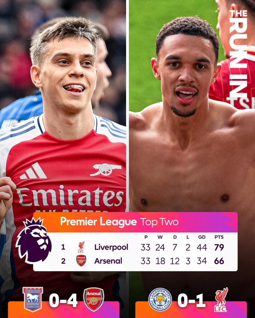 ធ្វើឲ្យ Liverpool មាន៧៩ពិន្ទុ ក្រោយឆ្លងកាត់ ៣៣ប្រកួត ឈ្នះ២៤ ស្មើ៧ និងចាញ់២ ខណ: Arsenal មាន៦៦ពិន្ទុ បន្ទាប់ពីលេង៣៣ប្រកួត ឈ្នះ១៨ ស្មើ១២ និងចាញ់៣លើក។